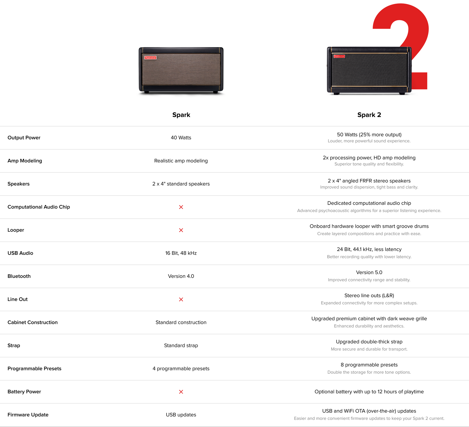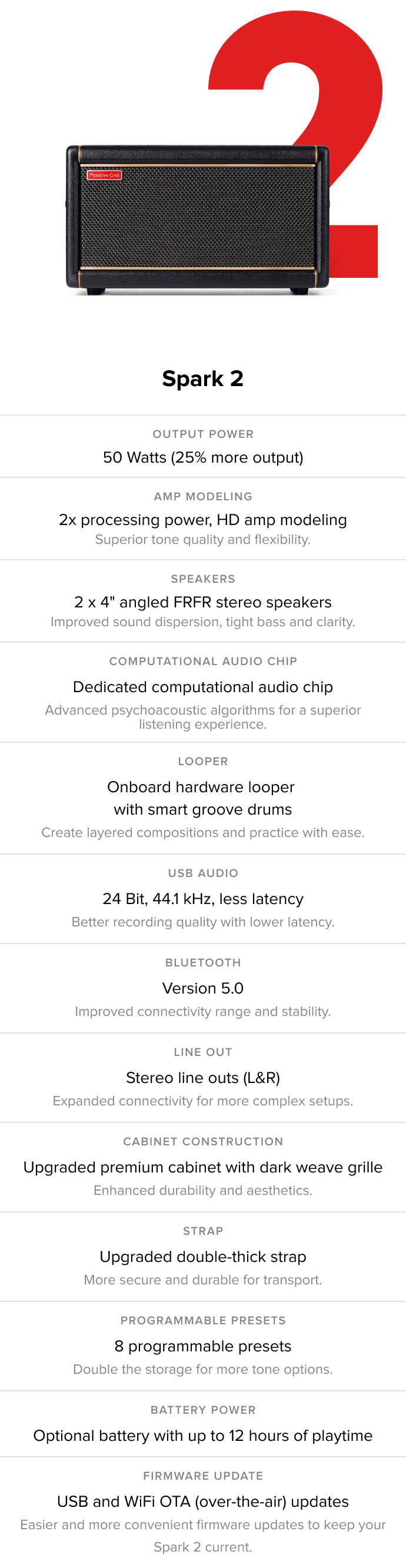 Spark 2 features an upgraded DSP and exclusive HD amp models, featuring new tube emulation, filter designs and cab sim IRs. Integrated multi-band dynamic range compression, virtual bass augmentation and stereo imaging deliver blow-your-mind sound.